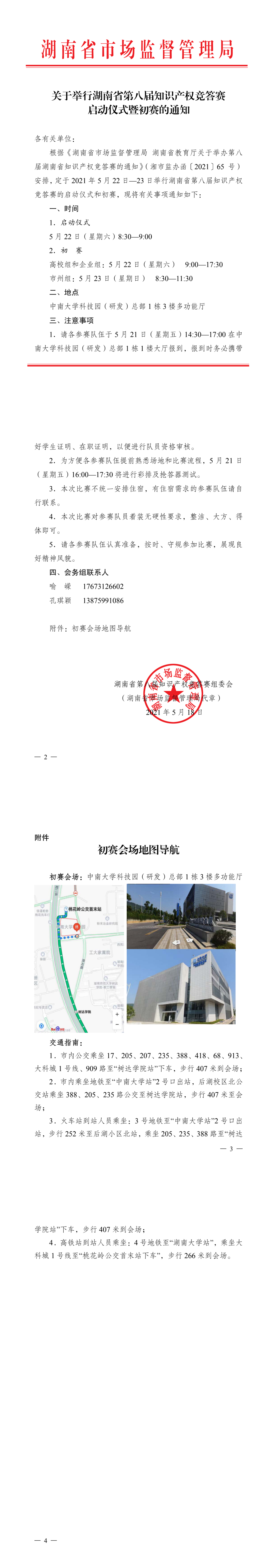 根据《湖南省市场监督管理局 湖南省教育厅关于举办第八届湖南省知识产权竞答赛的通知》(湘市监办函〔2021〕65 号) 安排,定于 2021 年 5 月 22 日—23 日举行湖南省第八届知识产权竞答赛的启动仪式和初赛,现将有关事项通知如下: