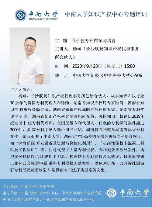 为落实教育部、国家知识产权局、科技部《关于提升高等学校专利质量 促进转化运用的若干意见》,提升学校知识产权管理水平和运用效益,促进学校“双一流”建设,特举办“高价值专利挖掘与培育”专题培训。