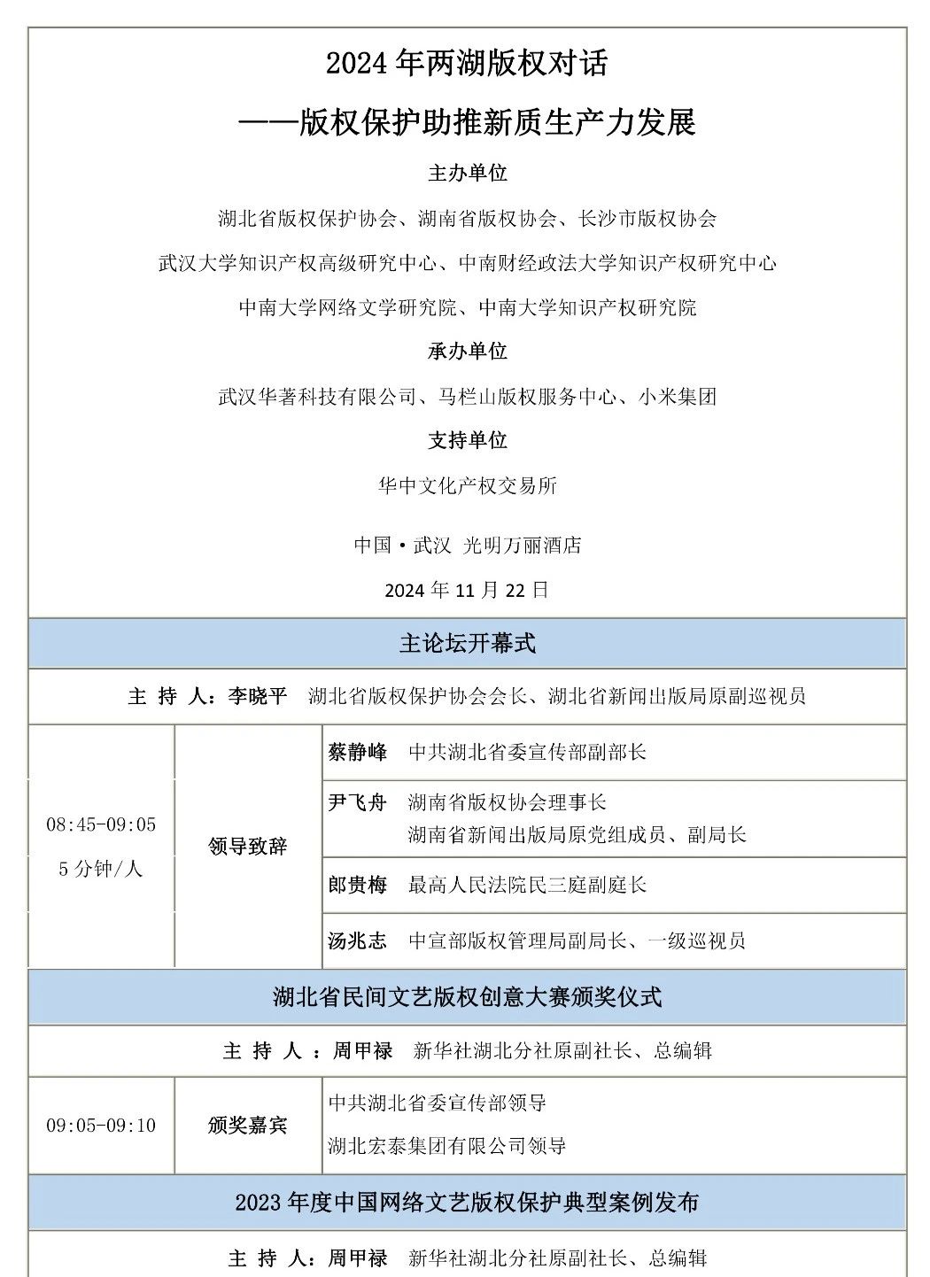 在此背景下,“2024年两湖版权对话——版权保护助推新质生产力发展” 会议将于2024年11月22日在武汉举行,旨在推动两湖地区版权产业的发展与知识产权保护的深化。