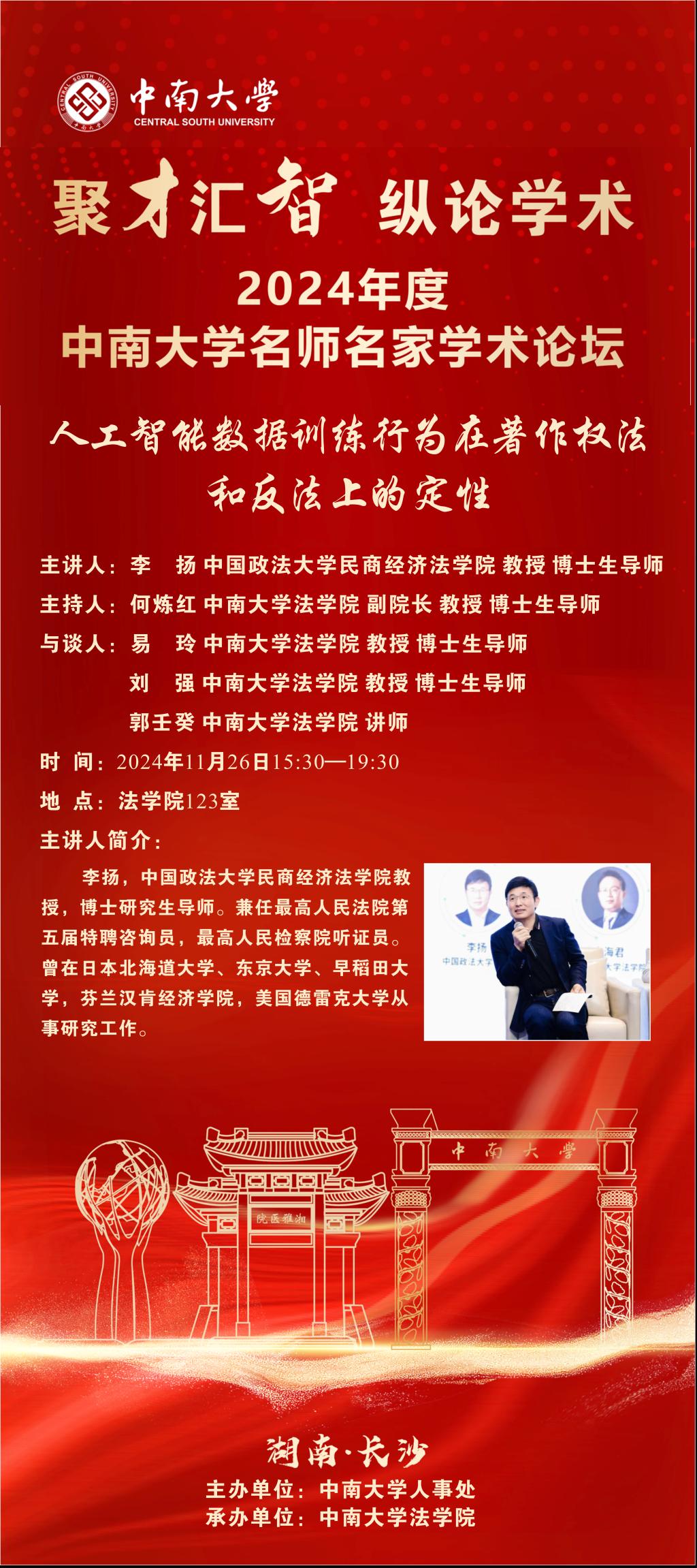 讲座预告 | 李扬:人工智能数据训练行为在著作权法和反法上的定性